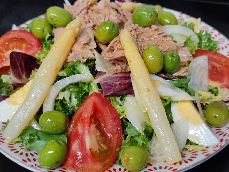 Base de lechuga de roble, tomate, cebolla, atún, aceitunas verdes, huevo cocido y espárragos blancos.