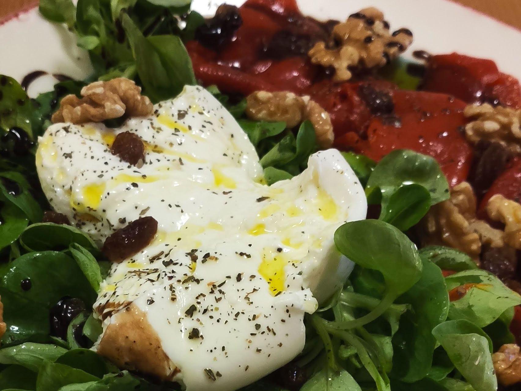 Base de canónigos, pimientos del piquillo, queso burrata y frutos secos.